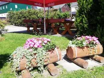 Im Sommer, bei schönem Wetter, ist unser Biergarten geöffnet, der oft auch Ziel zahlreicher Wanderer, Motorrad- und Fahrradfahrer ist. So richtig gemütlich wird es bei uns im Erzgebirge aber im Winter, wenn Schnee und Raufreif die Landschaft verzaubern. Durch die schneesichere Lage bietet der Ort ideale Wintersportmöglichkeiten. Für Langlauffreunde stehen 35 km gespurte Loipen zur Verfügung. Besonders beeindruckend für alle Gäste ist das geschmückte Erzgebirge zur Advents- und Weihnachtszeit, zu welcher man herrliche Spaziergänge durch den beleuchteten Ort Satzung unternehmen kann.