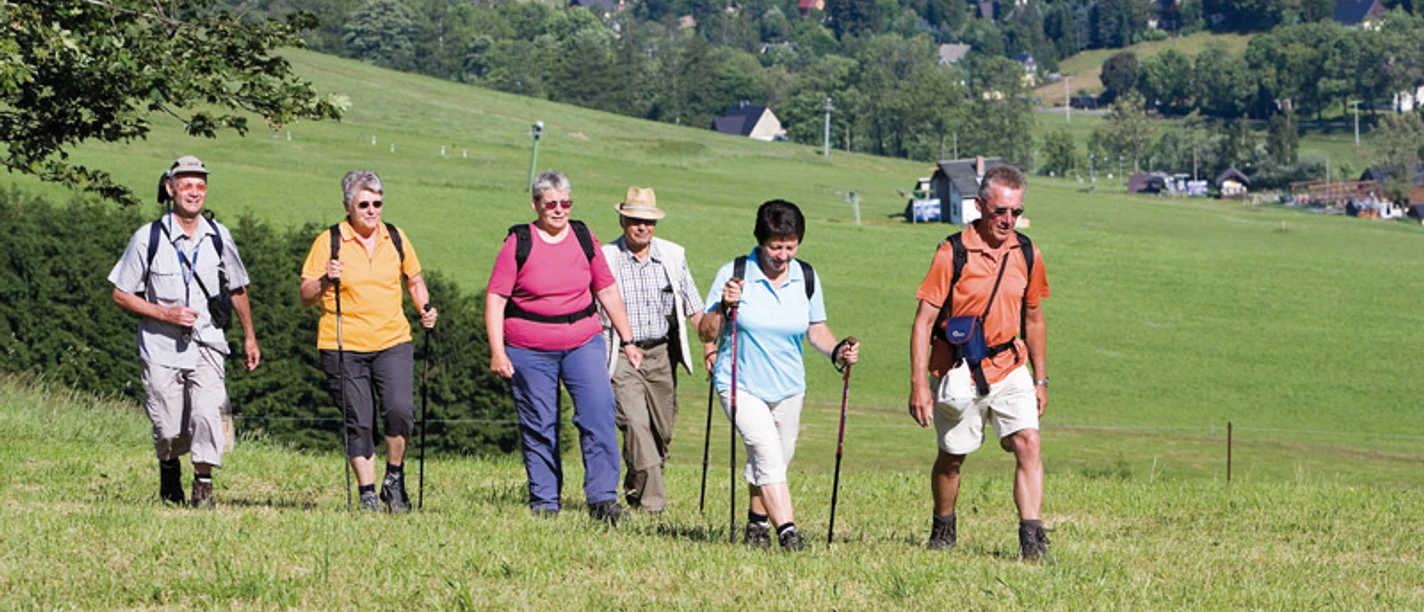 Sie starten die Tour Richtung Fischerbaude und laufen die Ringelstrasse in Richtung Torfhaus. Die “Torfstrasse” und im weiteren Verlauf die “Alte Torfstrasse” führt weiter in Richtung Teichhaus. Am Wanderabzweig “Alter Bahndamm” biegen Sie diesen nach rechts ein und gehen bis zum Eisenbahnerweg. (Einkehrmöglichkeit: Gaststätte zur Loipe). Weiter auf dem alten Bahndamm und später parallel dazu, vorbei am touristischen Grenzübergang wandern Sie immer den Weg weiter. Durch Wiesen und Täler erreichen wir den Ortsteil Neuhermsdorf und die Gaststätte Alter Bahnhof „SWF“ mit kleiner Ausstellung und Museum.Nach einer Stärkung geht`s in fast gleicher Richtung wieder zurück - laufen Sie oberhalb des SWF die Pflasterstrasse entlang bis der Asphalt beginnt. Dort biegen Sie links ein wieder in Richtung Bahndamm. Ein paar Schritte weiter biegen Sie nach rechts in den Waldweg ein (Ausgeschildert als Reitweg- Richtung “Altes Zollhaus”). Wandern Sie den Weg leicht bergauf bis zum Zollhaus und biegen dann nach links ab Richtung Holzhau.