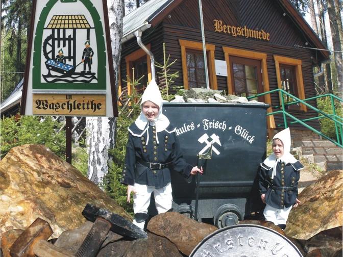 Gut gestärkt folgen wir bergbaulichen Spuren und fahren ins älteste Schaubergwerk Sachsens ein. Fahren – so sagte einst der Bergmann – heute läuft man und gelangt nach kurzer Zeit in eine faszinierende Untertagewelt mit glitzernden Steinen, imposanten Marmorsälen und smaragdgrünen Seen. Mit etwas Glück begegnet man sogar dem Berggeist, der tief im Berginneren wohnt. Doch damit nicht genug. Übertage gehört ein Besuch der Bergmännischen Erlebniswelt unbedingt dazu. Bergschmiede, Pochwerk und Erzwäsche machen Bergbau lebendig!