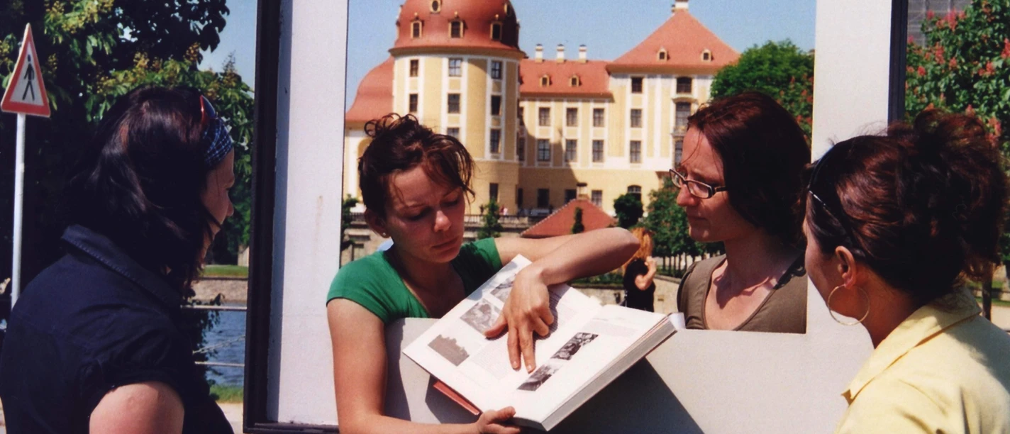 Die Tour beginnt mit Blick 1 in Moritzburg an der Schlossparkplatz- Nordseite. An der Schlossparkplatz-Südseite im Bereich einer Baumreihe erleben Sie den Blick 2. Verlassen Sie den Parkplatz über die Zufahrt und gehen Sie über die Schlossallee in die gegenüberliegende August- Bebel- Straße ca. 200 m, an der Abzweigung links in die Emil- Höhne- Straße. Sie gehen die Straße ca. 200 m entlang und sehen auf der rechten Seite den Blick 3. Hinter den markanten Torsäulen biegen Sie links ab, in 50 m wieder rechts in die Kleine Fasanenstraße. Folgen Sie nun der BRÜCKE Weg Ausschilderung bis zum Fasanenschlösschen. Blick 4 erschließt sich direkt vom Weg Große Fasanenstraße mit Blick auf das Fasanenschlösschen. Von der Anhöhe des Fasanenschlösschens konnen Sie Blick 5 und Blick 6 (ohne Tafeln) erleben. Im Nebengebäude des Fasanenschlösschens werden Ihnen Informationen zu den drei Bildern präsentiert. Verlassen Sie nun das Fasanenschlösschen auf der Sichtachse zum Jagdschloss in Richtung Kanal und folgen Sie der Ausschilderung zum Schlossteich. Queren Sie die Hauptstraße. Ihr Weg führt rechts um den Schlossteich, geradeaus durch den Schlosspark und weiter bis zur Kalkreuther Straße. Hier erwartet Sie Blick 7. Gehen Sie dann links in die Meißner Straße. Unmittelbar vor dem Schlossparkplatz biegen Sie rechts in die Straße Markt. Nach ca. 400 m Strecke können Sie im angrenzenden Borngartenweg an einer Hecke den Blick 8 entdecken. Nach weiteren 100m gehen Sie am ehemaligen Roßmarkt halb links in die Roßmarkt-Straße. Dort sehen Sie nach 100m auf der linken Straßenseite den Blick 9. Folgen Sie der Straße bis zur Einmündung auf die Schlossallee. In 500 m Richtung Schloss befindet sich der Ausgangspunkt der Nordtour.