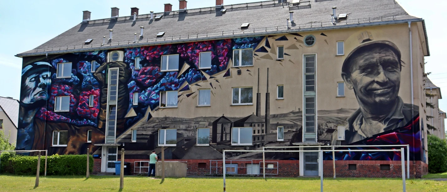 Vom Parkplatz des Bergbaumuseums gehen Sie die Pflockenstraße nach Osten in Richtung Lugau. Rechterhand verlief parallel zu dieser Straße der erste Eisenbahnanschluss ins Kohlenrevier. In diesem Gebiet gründeten sich auch die ersten größeren Steinkohlenabbau-unternehmen. Vor Beginn der Wohnbebauung biegen Sie links in die Heinrich-Heine-Straße ab. An deren Ende gehen Sie links in die Gottes-Segen-Schacht-Straße. Nun folgen Sie dieser bis am Ende rechtshaltend auf die Zechenstraße. Dieser folgen Sie nach links, am Ende kurz rechts und wieder links in den Fundgrubenweg. Sie durchqueren hier altes Schachtgelände mit der typischen Folgestruktur, zahlreiche Traditionspunkte mit Schautafeln an Hunten zeugen und informieren darüber. Hier befanden sich die größten Schächte des östlichen Teils des Reviers. Am Standort des ehemaligen Vertrauenschachtes wird an das Grubenunglück von 1867 erinnert. Von diesem Traditionspunkt erkennen Sie schon die Concordiasiedlung, umgangssprachlich genannt „De Cord“ in Oelsnitz, unser nächstes Ziel. Folgen Sie dem Fundgrubenweg bis ins Tal auf die Oelsnitzer Straße. Hier rechts ca. 150m bis zum Haus Nr.28, dahinter links einen kleinen Weg hinab, danach folgen sie weiter links einem Weg, der auf der ehemaligen Trasse einer Überlandstraßenbahn verläuft, die von Hohenstein-Ernstthal ins Kohlenrevier führte. Am Ende des Weges biegen Sie nach rechts in die Concordiastraße ab. Hier erkennen Sie jetzt links wieder die Wohnsiedlung „De Cord“ mit einem neuen großflächigen Street-Art-Objekt und im Anschluss rechts noch vorhandene Übertageanlagen, meist umgenutzt zu Wohnzwecken. So ist einer der ursprünglich 2 dort existierenden Fördertürme zu einem Wohnhaus umgebaut worden. Nach links auf der der Badstraße überqueren Sie den „Oelsnitzer Äquator“ und gehen unmittelbar daneben rechts zu einem großen Schulgebäude empor. Sie wenden sich jedoch nach links und überqueren die Straße auf einer Steinbrücke. Diesen Fußweg folgen Sie bis zu einer Halde. Auf einem Wiesenweg nach links umrunden Sie diese Halde im Uhrzeigersinn und gelangen über die obere Windberggasse geradeaus in die Robert-Schumann-Straße. Sie befinden sich inmitten einer Bergbausiedlung, deren Häuser modernisiert wurden. Die Kleinplastik „Bergmannskuh“ weist Ihnen den Weg nach links in die Franz-Schubert-Straße. Weiter geradeaus gehen Sie bergab auf dem Lerchenweg bis zur Einmündung in den Mühlweg. Hier spitz nach links dem Mühlweg folgend bis zur Einmündung in die Untere Hauptstraße. Gleich gegenüber geht eine kleine Straße ab, die Nansenstraße. Der folgen Sie bergauf und queren die Lugauer Straße in einen Weg, genannt die „Seilbahn“. Immer bergauf münden Sie am Ende des Weges in den Turleyring und haben an der Schule damit das Gelände des ehemaligen größten Schachtes des Reviers wieder erreicht. Sie können dann nach dem Förderschulzentrum links abbiegen und mitten durch das ursprüngliche Schachtgelände gehen. Sie bekommen einen Eindruck von der unterschiedlichen gegenwärtigen Nutzung der Anlagen und Erreichen sich rechts haltend den Parkplatz des Bergbaumuseums, den Ausgangspunkt der Tour.