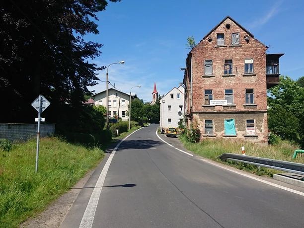 In Horní Poustevna (Obereinsiedel) angekommen, folgt man zunächst weiter der Hauptstraße und biegt dann nach links in Richtung Nová Viska (Neudörfel) ab.