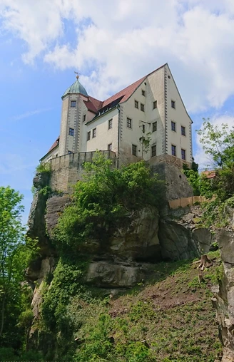 Nach dem Besuch der Burg wandert man wieder ein kurzes Stück zurück bis zum Rathaus und folgt dann von dort dem blauen Strich durch den Schindergraben ins Polenztal und vom Polenztal aus auf den Hockstein hinauf.