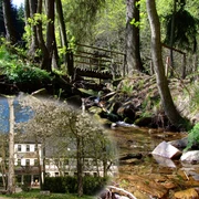 Zu den Bergbaurelikten gehört u.a. die idyllisch gelegene Holzbruchbinge mit kleinem Wasserfall, der etwa 100m neben dem Wegverlauf liegt. Um das Naturerlebnis zu genießen, sollte man sich die Zeit nehmen und von der ausgewiesenen Route kurzzeitig abweichen: Auf Route 1 (rot) führt zu Beginn der Tour auf der linken Seite der Rollerskistrecke ein ausgeschilderter Weg mit Treppen ins Tal. Ein schöner Blick öffnet sich zum Wasserfall und weiter bergab erreicht man ein Wassertretbecken mit Rastplatz. Danach geht es wieder hinauf auf die Rollerskistrecke und die Tour 1 wird wie ausgeschildert fortgesetzt. Auf Route 2 (grün) erreicht man den Wasserfall fast am Ende der Tour. An der Liedertafel 19 biegt man nach links ab und erreicht nach einigen Metern den idyllischen Rastplatz und das Wassertretbecken. Nach Aufstieg einiger Stufe hat man einen schönen Blick auf den Wasserfall. Zurück ins Tal wird die Route 2 entlang der Hüttenteiche bis zum Parkplatz vollendet.