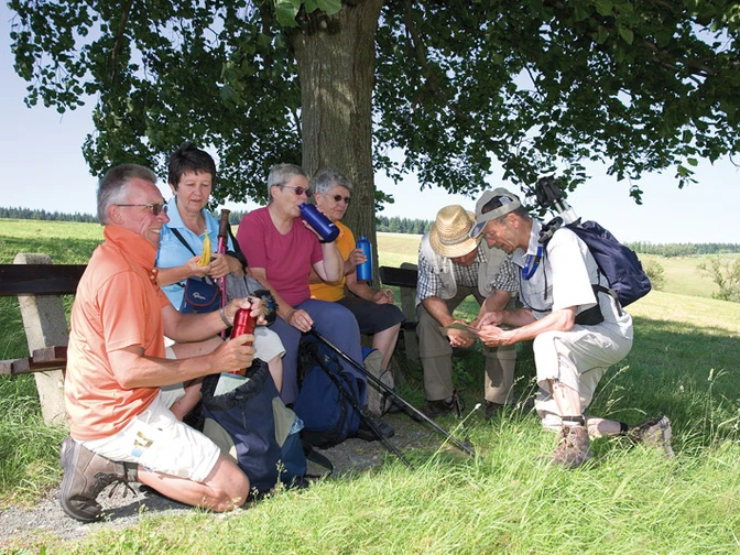 Der Lehrpfad (Naturschutzgebiet) geht weiter am “Kälberhübel” vorbei bergab zum Rastplatz “Trostgrundhütte”. Hier ist ein guter Platz für eine Rast und das Kneippbecken lädt zum Wassertreten ein. Nach links wandern Sie weiter den “Trostgrundweg” bergauf (gelber Strich) bis zur “Ringelstraße”. Hier biegen Sie wieder nach links ab Richtung „Fischerbaude. Nach dem Mehrfamilienhaus biegen Sie nach links ab und laufen dann schräg den Wiesenweg zum „Talblick“ hinüber.