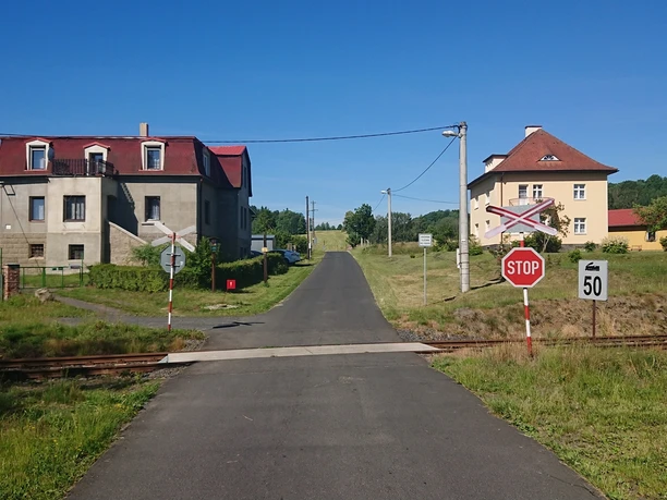 Die Tour starte am Bahnhof Mikulasovice stred und folgt von zunächst der Straße über die Bahnschienen hinweg, markiert mit einem blauen Strich) nach Tomasov.