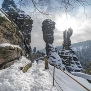 Der Wanderweg beginnt am Besucherbergwerk Marie-Louise-Stolln neben dem Fluss Gottleuba. Wir folgen dem Fußweg bis zur Straßenbrücke über die Gottleuba zum ehemaligen Bahnhof und dem Hunt zur Erinnerung an die letzte Schicht im Berggießhübler Bergbau. Der Weg führt an der Gottleuba entlang, am „Sächsischen Haus“ vorbei zum „Johann-Georgen-Bad“. Linker Hand liegt hinter der ehemaligen Eisenbahntrasse nach Bad Gottleuba ein kleiner Kurpark, „Fritzegarten“ genannt. Rechts gegenüber liegt das schöne Schloss des ehemaligen Gutes Friedrichsthal. Der Wanderweg führt weiter die Kneippstraße entlang, vorbei an dem Hochwasserdenkmal, das an die Hochwasserkatastrophe von 1927 erinnert, zum Kirchberg. Bei der Katastrophe wurde in der Nacht vom 8. zum 9.7. eine ganze Häuserzeile neben der Gottleuba durch eine 4 m hohe Flutwelle weggespült und 88 Einwohner ertranken. Wir wandern weiter über den Kirchberg, entlang des Poetenweges bis neben die ehemalige Hänselmühle. Danach zweigt der Weg nach links vom Poetenweg in Richtung Giesenstein auf die Hochebene ab. Wir gehen links an der Wald- bzw. Hangkante entlang, bis wir den Weg zur Panoramahöhe, die so genannten Hexenstufen, kreuzen. In der Zeit des Bergbaus kam hier ein Arbeitsweg der Gottleubaer Bergleute vom Mutter Gottes Lager herab und führte weiter nach Giesenstein – der Zechenweg. Weiter geht es auf dem Weg entlang der Waldkante bis hinab nach Giesenstein. Links neben dem Weg im Wald kann man die tiefen Höhlen bestaunen, die die Fuhrleute mit den umfangreichen Erztransporten vom Erzlager zu den Hütten und Hämmern verursachten. Der Zechenweg diente in der Vergangenheit auch zum Transport der Eisenerze (Eisenstraße).Der Wanderweg führt am Schloss Giesenstein vorbei in Richtung Bad Gottleuba bis zu dem kombinierten Fuß- und Radweg. Wir folgen diesem Weg bis an den Aufstieg zum Siedlungsweg, gehen diesen weiter über den Finkenweg, den Goethepark zur Badstraße und weiter zum Markt. Auch ein Abstecher zur nahe gelegenen Kirche lohnt sich. Nun überqueren wir den Markt, laufen an einer historischen Postdistanzsäule und dem Kirchgemeindehaus vorbei und gelangen schließlich auf die Talstraße nach Hartmannsbach. Vorbei an der alten Bähr-Mühle zum Abzweig nach Hartmannsbach erblicken wir auch die Fischermühle. Die Talstraße verfolgen wir entlang der Gottleuba bis zum Hammergut Haselberg. Der Wanderweg folgt der Straße nach Oelsen bis zur Kreuzung mit der alten Baustraße („An der Talsperre“). Er überquert diese und folgt dem „Alten Oelsener Weg“ in Richtung Oelsen, der gleichzeitig ein Teilstück des alten Kulmer Steiges ist (Kulmer Steig ist ein Synonym für Verkehrsverbindungen aus dem Elbtal über das östliche Osterzgebirge ins böhmische Kulm. Er ist ein Altstraßensystem teilweise verfallener und unbefestigter historischer Verkehrswege). Die Wanderung führt an einem alten bronzezeitlichen Hügelgrab am Kulmer Steig vorbei. Unser Weg verläuft weiter entlang der „Alten Oelsener Straße“ bis zur Fahrstraße nach Oelsen und Breitenau. Hier müssen wir nun ein Stück entlang der Fahrstraße laufen. Unsere geplante Tour führt ab der Jungrinderanlage wieder auf einem Wanderweg entlang in Richtung des neuen Friedhofs Oelsen. Von da aus gelangt man entlang des Fahrweges nach Oelsen zu der schönen Dorfkirche. Nun müssen wir noch die Oelsener Straße weiter entlang laufen, immer noch auf der Trasse des vorgeschichtlichen Kulmer Steiges, kommen an einem alten Steinkreuz vorbei und sind schließlich auf der Oelsener Höhe angekommen. Hier bietet sich eine gute Möglichkeit, ein schönes Picknick zu uns zu nehmen um noch die „Höhenluft“ und die Aussicht etwas länger zu genießen. Haben wir uns dann für den Rückweg bereit gemacht, laufen wir zuerst wieder in Richtung Oelsen. An der Oelsener Kirche führt uns der Weg nach links in Richtung Fahrstraße. Diese überqueren wir aber nur und laufen weiter in Richtung Talsperre Gottleuba, bis wir den Hohlen Stein erreichen. Nun führt der Wanderweg immer weiter entlang der Talsperre in Richtung Bad Gottleuba. Nach einiger Zeit treffen wir wieder auf die Kreuzung zwischen der Talstraße und der „Alten Oelsener Straße“ bzw. dem Kulmer Steig. Diesmal folgen wir der „Alten Oelsener Straße“ nach Norden und gelangen auf die Hellendorfer Straße, die weiter nach Bad Gottleuba führt. Unser Weg durchquert Bad Gottleuba (wieder über den Markt), geht weiter auf der Pirnaer Straße und zweigt schließlich nach rechts auf die Bahnhofstraße ab, bis er wieder auf die Siedlungsstraße trifft, die wir bereits auf den Hinweg gelaufen sind. Wer keine Kondition mehr hat, läuft von nun an ähnlich dem Hinweg und spart sich überflüssige Höhenmeter. Wer allerdings noch eine schöne Aussicht genießen will, geht nach einigen weiteren Metern rechts den Hang hinauf in Richtung Panoramahöhe und kann dort vom Bismarckturm aus einen wundervollen Rundumblick über die Sächsische Schweiz genießen. Nach diesem krönenden Abschluss dieser anstrengenden Tour ist es noch ca. ein Kilometer bis zurück nach Berggießhübel, wo wir über den Kirchberg und den Pfarrweg (vorbei an der St. Petri Kirche Berggießhübel) wieder unseren Ausgangspunkt erreichen.