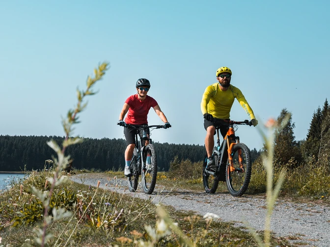 Die Tour führt über den Kirchsteig in Richtung Kottenheide, entlang schattiger Waldwege nach Muldenberg. Hier lohnt sich ein Abstecher zur Talsperre mit begehbarer Staumauer und zahlreichen Einkehrmöglichkeiten. Der Weg schlängelt sich nach Schneckenstein, ein kleiner Ort mit Besucherbergwerk, Mineralienzentrum und einzigartigem Topasfelsen. Es geht weiter auf dem Kamm nach Mühlleithen und wieder hinunter in den Klingenthaler Ortsteil Brunndöbra. Von hier ist die bekannte "Sparkasse Vogtland Arena" - eine der modernsten Skisprungschanzen Europas - leicht zu erreichen. Über Kottenheide und das Wolfsbachtal führt die Tour zurück nach Schöneck.