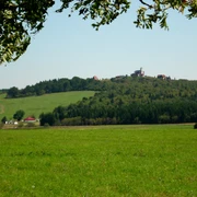 Vorbei an der Kirche bis zur roten Wegemarkierung PKW-Parkplatz rechts in den Wald auf dem Kamm des Osterzgebirges. Der gut ausgeschilderten roten Wegemarkierung über Wald- und Wiesenwege folgen wir auf dem „Bierweg“ und verweilen kurz an der „Bierrast“, unmittelbar danach erreichen wir einen asphaltierten Weg und erblicken links den Mückenberg (Komáří hůrka) mit dem Aussichtspunkt und Hotel Mückentürmchen (Komáří vížka). Von da bietet sich ein traumhafter Blick über das Böhmische Becken