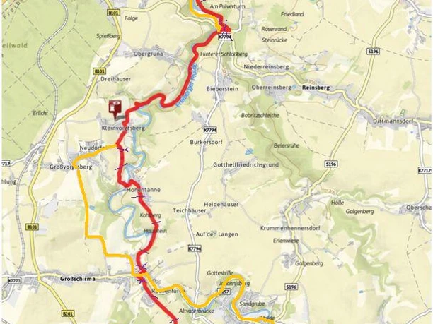 Tour A für beladene Radler (rote Route): 400 m nach Überquerung der Mulde in Rothenfurth biegen Sie am Abzweig „Agrargenossenschaft Großschirma“ rechts ab, anschließend nach 500 m nach links und fahren nach Großvoigtsberg. Dort biegen Sie nach etwa 400 m auf der Hauptstraße links Richtung Kleinvoigtsberg ab, wo die Mulderadweg Beschilderung beginnt (weiter Richtung Obergruna).