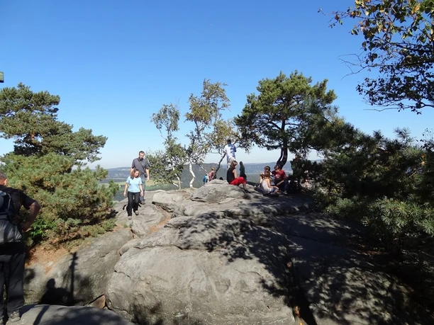 Oben angelangt, sollte man nach kurzer Pause an der nächsten Kreuzung nach links einbiegen, wo die atemberaubende Aussicht auf den Gohrisch und den Papststein wartet. Zurück auf dem Hauptweg geht es weiter bis zu einem Abzweig, der zum »Opferkessel« führt, einer kesselförmigen Vertiefung, die vermutlich in der letzten Eiszeit entstanden ist. Hier offenbart sich wieder ein wunderbares Panorama.