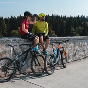 Entlang der Klingenthaler Straße fährt man ortsauswärts in Richtung Meiler, am ehemaligen Sägewerk und Reiterhof vorbei. An der Loipentafel überquert der Weg die Bahnbrücke und biegt auf den Muldenbrandweg ein. Der Weg nach Grünbach schlängelt sich durch schattige Wälder, die zum Rasten einladen. Über den Musikantensteig gelangt man zum Rehhübel (787m) sowie der Felsengruppe des Kleinen und Großen Affensteins und erreicht schließlich Grünbach. Hier stehen Anschlussmöglichkeiten an überregionale Radwege zur Verfügung. Am Bahnhof vorüber führt die Tour ins Tal der Weißen Göltzsch, an den Rissfällen entlang und über die zugehörige Rissbrücke kommt man nach Hammerbrücke. Weiter geht es nach Muldenberg zur Talsperre, von wo aus schließlich wieder der Rundweg hinauf nach Schöneck erreicht wird.
