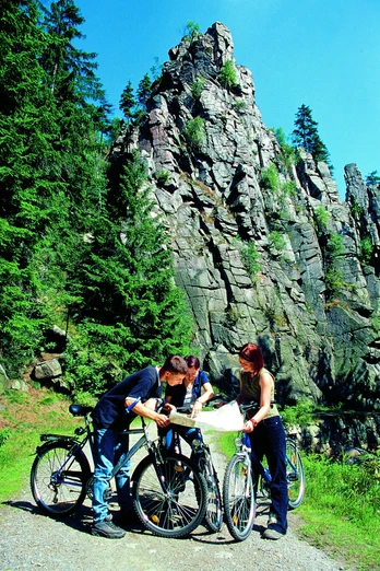 Start ist auf dem Wanderparkplatz im Hinteren Grund in Pobershau. Entlang der Schwarzwassertalstraße geht es ca. 6,5 km durch das Naturschutzgebiet in Richtung Kühnhaide. An der Steinernen Brücke biegt man rechts ab und folgt dem Neuen Brückenweg bis zum Pobershauer Flügel. Bis hier ist die Strecke mit dem grünen Radwegsymbol gekennzeichnet. Nun hält man sich weiter geradeaus auf dem Pobershauer Flügel bis zur Kreuzung Niederer Steinweg. An dieser Stelle wird rechts abgebogen in Richtung Katzenstein, vorbei an der Bergschänke am Katzenstein, zur Bergstraße und von dort zurück zum Wanderparkplatz.