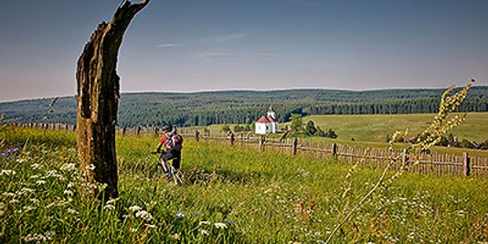 Ab Zentrum Bozi Dar (Gottesgab) fahren wir der Route 23 folgend an den Skiarealen Neklid und Klínovec (Keilberg 1244 m), dem höchsten Gipfel des Erzgebirges vorbei. Vom Aussichtsplateau mit seit 2013 wieder geöffnetem rekonstruiertem Aussichtsturm bietet sich ein umfassender Rundblick über das Erzgebirge und weite Teile Nordböhmens. An weiteren Tausendern entlang geht es ohne Anstrengung bis nach Měděnec (Kupferberg ). Hier können Bergbauzeugnisse und Mineralien im Besucherbergwerk besichtigt werden. Weiter bergab kommen wir zur Pressnitztalsperre, Trinkwasser-Reservoir für die Menschen im Egertal und Nordböhmen. Hier biegen wir an der 50 m hohen Staumauer ab und begeben uns am Jelení Hora (Haßberg 993 m) bergauf an der deutsch-tschechischen Grenze entlang des Hochmoorgebietes bis nach Načetin (Natschung) und weiter bis Kalek (Kallich), einem kleinen Bergdorf in 700 m ü. NN mit weithin sichtbarer Bergkirche. Die Etappe endet im Grenzort.