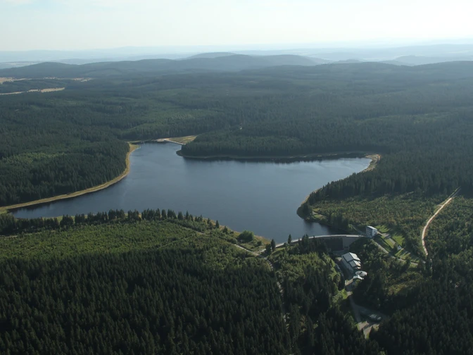 Von der Trinitatiskirche führt die Tour zunächst über Buttergasse und Talsperrenstraße hinauf bis im Wald der Abzweig zur Staumauer der höchstgelegenen Trinkwassertalsperre Deutschlands (904 m) erreicht wird. Hier könnte schon ein kurzer Abstecher (200 m) auf die Staumauer erfolgen. Wieder zurück auf dem breiten Waldweg (Sachsenberger Weg) führt die Wanderung in weitem Bogen Richtung Süden um die Talsperre herum. Das westlich benachbarte Vogtland ist teilweise nur knapp 100 Meter entfernt. In einer kleinen Senke wird der natürliche Zufluss, die Wilzsch, überquert und an der nächsten Wegekreuzung links auf dem Flößweg weitergewandert. Hier verläuft im Winter auch die Kammloipe Erzgebirge-Vogtland. Eine kleine Wegkuppe bildet bald den höchsten Punkt (943 m) der Wanderung. Danach geht es sogleich links den Sauersacker Steig hinab und nach mehrfachem auf und ab wird wieder die Staumauer, diesmal auf der anderen Seite der Talsperre, erreicht. Nach dem Überqueren der etwa 200 m langen Bruchsteinmauer geht es wieder hinab nach Carlsfeld.
