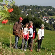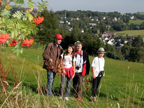 Der Weg beginnt im Zentrum Seiffens und führt ein Stück die Bahnhofstraße bergauf. An der nächsten Kreuzung halten Sie sich halbrechts und gehen in Richtung Ortsteil Steinhübel. Dort im Bebauungskern gehen Sie wieder rechts ab, bergwärts weiter durch Felder und Wiesen bis zum Waldrand und hier nach links. Dahinter gehen Sie rechts am Talhang entlang. Bald durchqueren Sie eine große Schonung in der Sie den Weg über die Brücke nehmen (bitte Tore schließen). Nach kurzer Zeit finden Sie rechts, dicht am Weg einen Block aus Serpentinstein - den legendären Taufstein. Der Weg führt dann weiter hinab auf die Talstraße, der Sie bis in den Ortskerns Neuhausens folgen. Den Rückweg nach Seiffen (rote Markierung) treten Sie gegenüber der Neuhausener Kirche an. Der Weg führt rechts in Richtung Schwartenberg (ein Abstecher lohnt sich) wieder zum Ausgangspunkt in Seiffen.