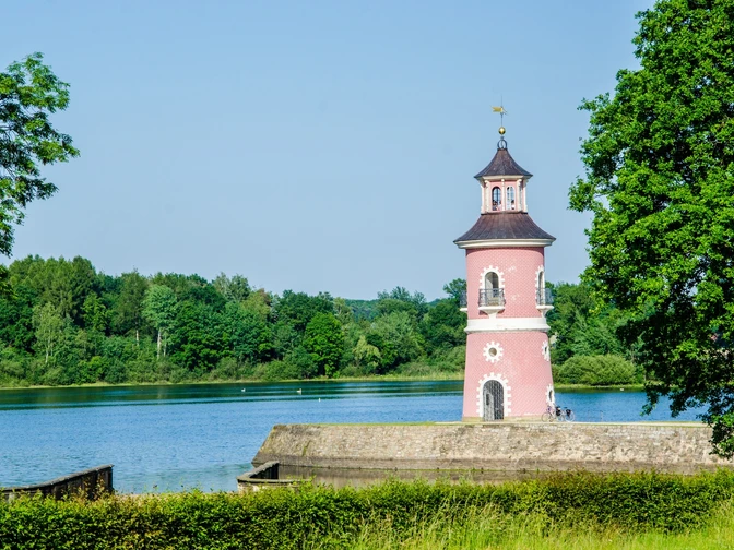 Im Moritzburger Ortsteil Eisenberg treffen Sie auf die Schmalspurbahn, wandern nach Bad Sonnenland und erreichen über Georgenteich und Räuberhütte die Dardanellen. Über Waldschänke, Leuchtturm und Schlossteich geht es zur Kreuzung Kalkreuther Straße.