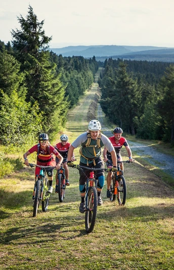 Direkt nach der Stempelstelle am Berghotel Klinovec geht es direkt los ins Trailvergnügen. Fast 4 Kilometer des Rubin-Trails können genutzt werden bevor es über einen Verbindungsweg wiede rhinauf in Richtung Bozi Dar geht. Wer nicht ganz trailsicher ist, kann den Azur-Trail nutzen, auch hie rist der Stoneman beschildert. Auf dem weiß-rot-weiß markierten oberenen "Neklid-Pfad" passiert die Route die X-Cross-Strecke und führt nach Bozí Dar (Gottesgab). Der Ort ist einen der bedeutensten Wintersportzentren Tschechiens und Heimat von Lukás Bauer, dem erfolgreichsten Skilangläufer des Landes und Stoneman-Miriquidi-Messenger. Hier beginnt die Auffahrt zum Fichtelberg: Über die Grenze nach Deutschland, vorbei am "Relaxhotel Sachsenbaude" und weiter auf der Wellenschauckel zum mit 1.215 m höchsten Gipfel in den neuen Bundesländern ("Hotel Fichtelberghaus" mit Aussichtsturm, Bergstation der ältesten, 1924 erbauten Seilschwebebahn Deutschlands). Der Fichtelberg besteht aus kristallinen Gesteinen.
