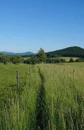 Von dem Aussichtspunkt folgt man dann zunächst einem roten Dreieck und dann später dem roten Strich in Richtung Brtniky, wobei man nach dem Abstieg vom Berg unterhalb des Berges quer über eine Wiese bzw. Weide laufen muss - runter zu den Gebäuden.