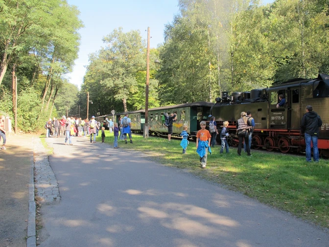Nach einer romantischen Zugfahrt mit dem Lößnitzdackel bis zum Haltepunkt Friedewald geht es über den reizvollen 13-Brücken-Weg nach Lindenau, weiter zum Seerosenteich und über den Gabelweg zum Hohen Stein. Von hier führt die Wanderung vorbei an der Moselwiese und der „Dicken Hanne“ zum Forsthaus Kreyern. Weiter geht es über den Nordweg zum Fuchsberg und Spitzberg, ehe Sie wieder zum Spitzgrundteich absteigen.