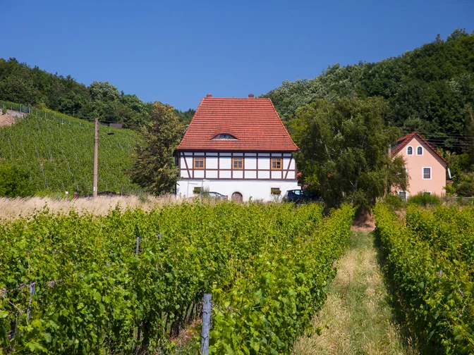 Nach der Besichtigung der Blaudruckerei führt die Wanderung hinauf zur Besenwirtschaft Wöhler oberhalb des Elbtals, durch den Rietzschkegrund und zum Weingut Rößler. Über den Aussichtspunkt Zechstein zur Besenwirtschaft Schuricht und entlang des Sächsischen Weinwanderweges zum Weingut Matyas. Auf dem Waldlehrpfad durch die Südhänge des Friedewaldes geht es zurück zum Spitzgrundborn und ans Ziel Spitzgrundteich.