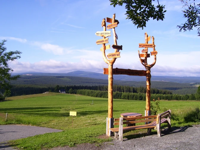 Sie starten die Tour vom oberen Wanderparkplatz am Bärenstein und gehen in nordöstlicher Richtung auf dem weiß-blau-weiß markierten Weg (E3), bis im Tal die Kammweg-Markierung auftaucht. Dieser folgen Sie nun. Das Teilstück entlang des Flößgrabens und des Pöhlbaches ist einfach romantisch. Nach der Brettmühlen-Einkehr wandern Sie ,weiß-gelb-weiß markiert, aufwärts gen Kühberg. In der Kerzenwelt geht jedem ein Licht auf. Sie ziehen aber nicht selbige, sondern gehen weiter, denn Sie wollen ja noch den Bärenstein erklimmen. Dafür laufen Sie den Kammweg in die andere Richtung. Der Steilaufstieg! Kleine Steighilfe: Der Berggeist vom Goldkämmerchen am Bärenstein gibt aller 100 Jahre sein Geheimnis preis - am Tag Ihrer Wanderung? Nach der Einkehr im Berghotel gehen Sie wenige Meter zurück zum Gipfelkreuz und weiter über den Kammweg zum Ausgangspunkt.