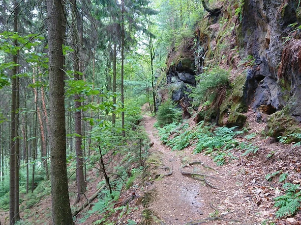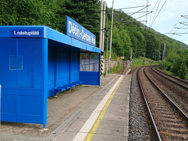 Die Tour startet am Haltepunkt "Decin-Certova Voda" und führt von dort zunächst dem gelben und dann dem grünen Strich nach den Berg hinauf nach Maxicky (Maxdorf).