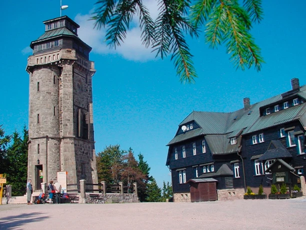 Vom Tourist-Service-Center Eibenstock (640 m ü. NN) zunächst heraus aus der Stadt und hinab in das schöne bewaldete Tal der Großen Bockau. Nach Überquerung der Rektorbrücke (hier tiefster Punkt der Tour mit 570 m ü. NN) beginnt der eigentliche Aufstieg über den Bärenweg. Der letzte Abschnitt hinauf zum Auersberg führt hinter dem „Großen Stern“ (Schutzhütte) sprichwörtlich über die Himmelsleiter bis zum Gipfel in 1.018 m Höhe. Belohnt wird der Wanderer u.a. auch mit einem herrlichen Ausblick vom ältesten steinernen Aussichtsturm (1860) des Erzgebirges. Der benachbarte Berggasthof entstand 1907. Beim Abstieg über den Schlangenweg wird das idyllische Wildenthal, eine der ersten Sommerfrischen des Erzgebirges, erreicht. Durch das tief eingeschnittene Tal der Großen Bockau erreichen Sie nach etwa 5 km in nördlicher Richtung wieder den Ausgangspunkt in Eibenstock. Die gesamte Rundwanderung führt durch herrlichen Hochwald und immer wieder bieten sich Ihnen vorzügliche Ausblicke. Begleitet werden Sie auf Ihrer Tour nur vom Rauschen der mächtigen Baumwipfel und den munter murmelnden Bächen.