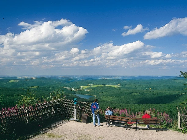 Vom historischen Aussichtsturm reicht die Sicht an ganz klaren Tagen ca. 100 km bis Leipzig (markant das Kraftwerk Lippendorf) im Norden und bis zu den höchsten Gipfeln des Bayerischen Waldes (Großer Arber 160 km) im Süden.