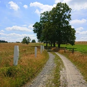 Nachdem man die Aussicht genossen hat, geht es dann hinter dem Aussichtsturm weiter den Pfad entlang in den Wald hinab, wo man dann zunächst dem gelben Strich bis zur nächsten größeren Kreuzung folgt. An dieser biegt man dann nach links ab und folgt der Radroute 3014 bis zum Stausee "Podhaji".