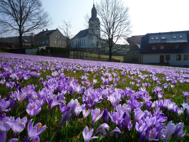 Das Waldhufendorf Drebach schmiegt sich sanft in ein Nebental der Zschopau, eingebettet in grüne, teils baumbestandene Hügel. Und hier, in dieser 2400-Seelen-Gemeinde, kündet jedes Jahr ein lila Blütenmeer vom nahenden Frühling – die Krokusse zeigen auf einer Fläche von sieben Hektar ihre volle Pracht. Für einen Besuch wird die aufgezeigte Route empfohlen. Ferner befindet sich hier ein wahres Kleinod, ein Zeiss-Planetarium, das im Jahr 2014 mit modernster Zeiss-Projektionstechnik ausgestattet wurde. Es bietet seit nunmehr 30 Jahren interessierten Gästen die Möglichkeit, durch das Weltall zu reisen und den Astronauten bei ihrer täglichen Arbeit über die Schulter zu sehen. Vor einer Veranstaltung empfiehlt sich ein Besuch der Gaststätte »Erbgericht«, das mit zünftiger Kost seine Gäste zu bewirten weiß.